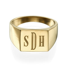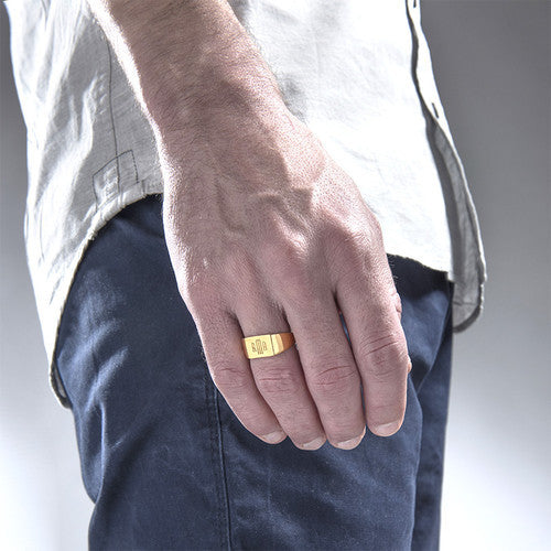גרסא זו של טבעת החותם מכסף אך בציפוי זהב, היא וריאציה ייחודית שתתאים למי שאוהב לענוד תכשיטים בולטים ומעניקים מראה גברי וקשוח. תוכלו לעצב אותה בעזרת האותיות שתחברו לחרוט עליה, והיא ללא ספק תהיה מתנה מיוחדת למישהו מיוחד שאתם יודעים שהיא תתאים לו על כף יד גברית. טבעת זו קיימת גם בכסף.
